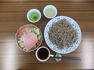 そばのほかに、タンパク源として「ハム入りサラダ」も添えました。キュウリ、ミニトマトは、えんがわ農園のもぎたてを使い、足りない分はえんがわさんが自宅から持参してくれました。この日も猛暑だったので「二八そば」は、ことのほかおいしいものでした。』