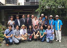 県立玄界高校の邦楽部さんによる和太鼓の演奏から始まり、薬王寺の湯・鬼王荘さんで郷土料理・鶏すきや古賀三線島唄会の皆さんによる演奏、炭坑節などの踊りを楽しんでもらいました。その後は、国内屈指の独自商品を台湾や米国など9カ国・地域で販売する増田桐箱店さんや創業100周年を迎えたニビシ醤油さんを見学させていただきました。さまざまなご配慮を含めご協力いただいた地元の皆さまに心から心から感謝を申し上げます。