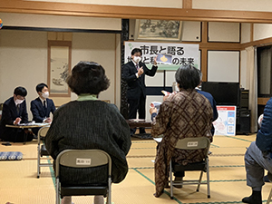 13日夜、2022年度から10年間の第5次総合計画策定に向けたタウンミーティング(対話集会)を高田区で開催しました。