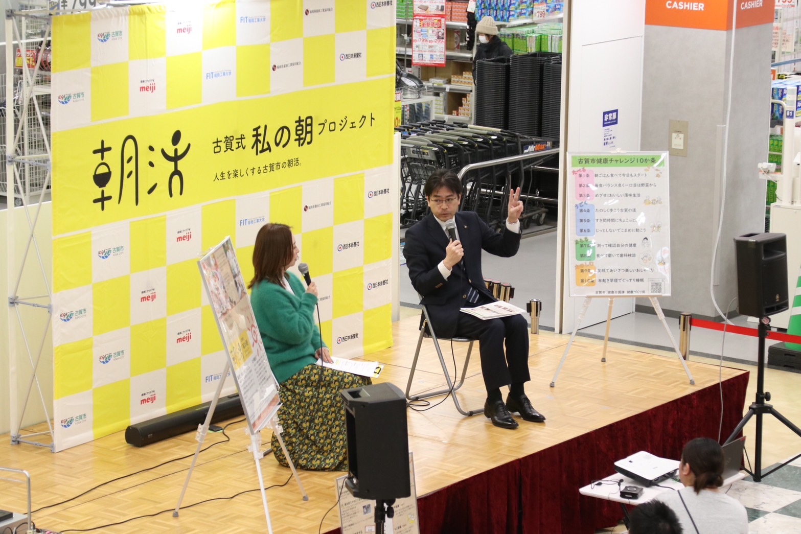 今回のトークセッションは、古賀市が明治、福岡工業大学、福岡県醤油工業協同組合、西日本新聞社とタッグを組み、産学官連携で立ち上げた「古賀式私の朝プロジェクト」の一環。福工大の学生さんには児童生徒用のタブレットでできる健康チェックのプログラムもつくってもらい、今年度既に小中学校3校で導入&次年度全校に広げる予定で、イベント会場にはその体験ブースも設けてもらいました。