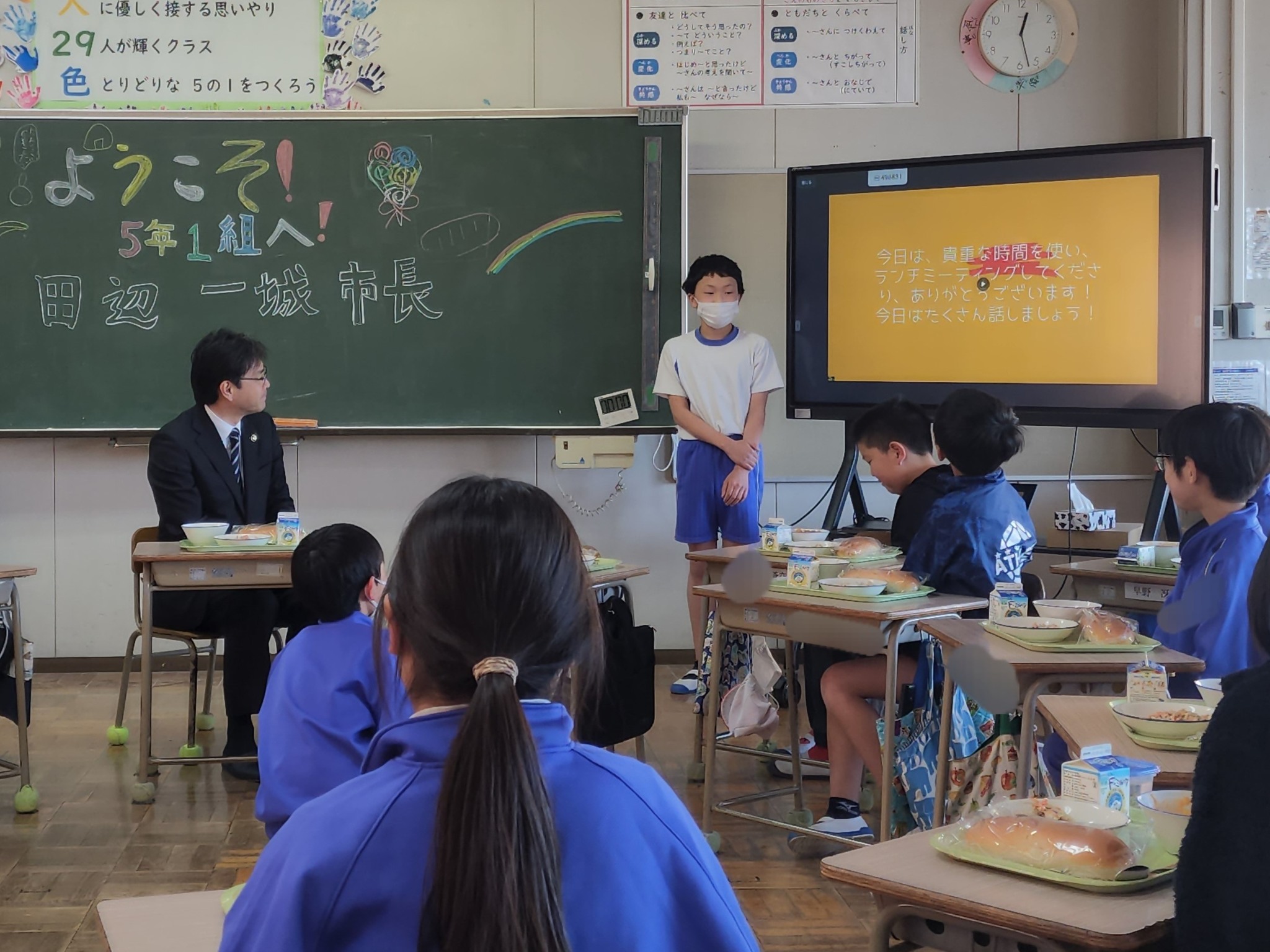 古賀市は給食の時間に市長と教育長が毎月どこかの学校に現れます。小学校は5年生、中学校は2年生。私の公約である主権者教育と子どもアドボカシーの一環です。今月は舞の里小学校を訪ねました。みんな元気、元気!