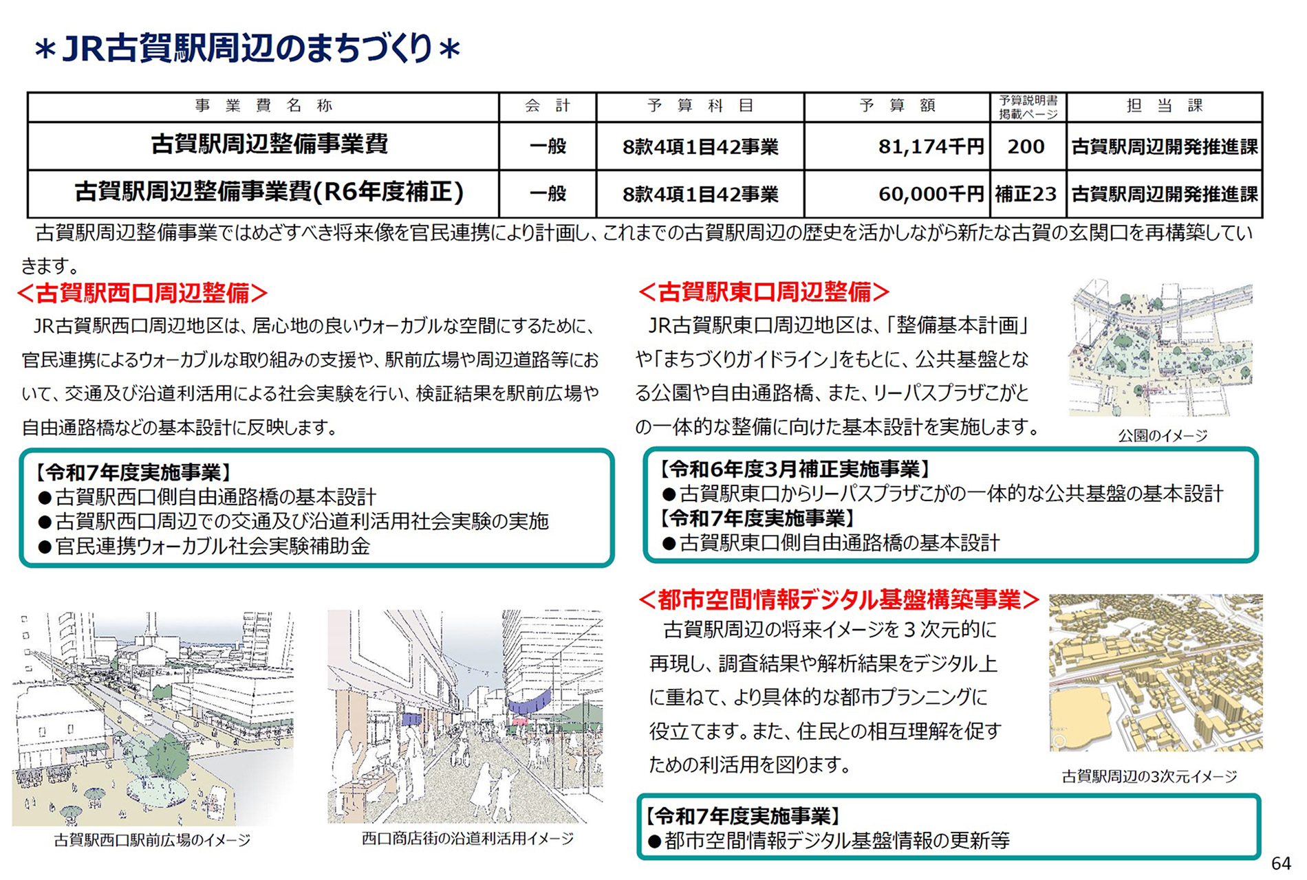 2025年度の施政方針演説で打ち出した「まちの改造・再編」の「1丁目1番地」が中心市街地のJR古賀駅周辺開発。当初予算案では、東口からリーパスプラザこがの一体的な整備と東口と西口の自由通路橋の基本設計を実施すると共に、デジタル技術で開発空間の将来イメージを3次元的に再現し、市民の皆さんと共有できるようにします。(今年度補正予算案の内容を含む)