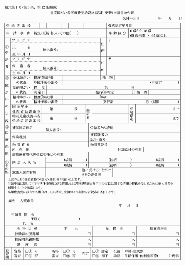 (1) 重度障がい者医療費受給資格(認定・更新)申請書兼台帳 様式第1号