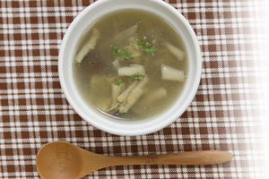 沸騰させたお湯にチキンコンソメを入れ、食べやすい大きさに切ったごぼう、しめじ、えのきを加えて煮る。