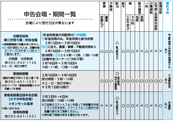 ※予約に関する注意事項 ・当日予約はできません。 ・予約をせずに来場された場合は、キャンセルなどの空き時間が出た場合に限り、順番に受付けします。 ・65歳未満の人、年金以外の所得の人については職員及び税理士の対面受付はありませんので、自書申 告コーナーをご利用ください。 |