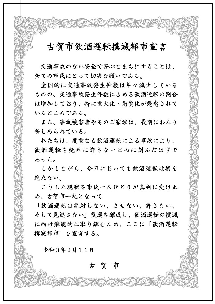 市では改めて飲酒運転撲滅を呼びかけ、古賀市一丸となって飲酒運転撲滅に取り組むため、令和3年2月11日に「古賀市飲酒運転撲滅都市宣言」を宣言しました。