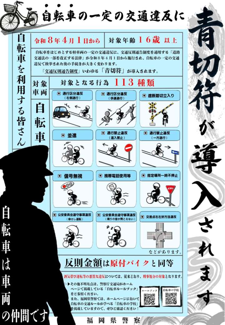 令和8年4月1日より施行される道路交通法の一部改正により、16歳以上の自転車の運転者に対し「交通反則通告制度(青切符)」が適用されます。