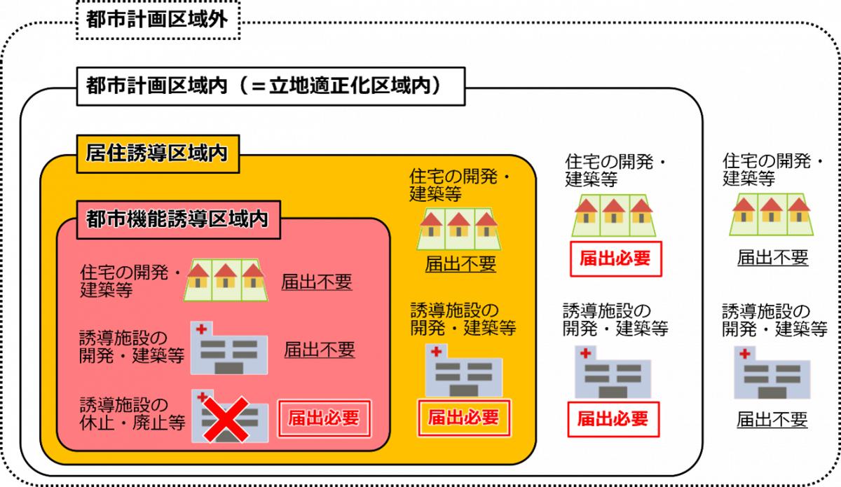 そのため、令和8年7月1日以降は、居住誘導区域外で一定規模以上の住宅を建築する場合や、都市機能誘導区域外で誘導施設を建築する場合、又は都市機能誘導区域内で誘導施設を休止又は廃止する場合は、行為に着手する30日前までに市長へ届出が必要です。
