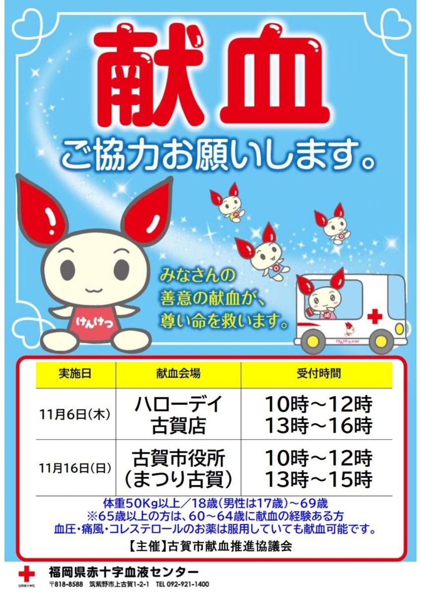 | 11月6日(木) | ハローデイ古賀店 | 10時00分~12時00分 |